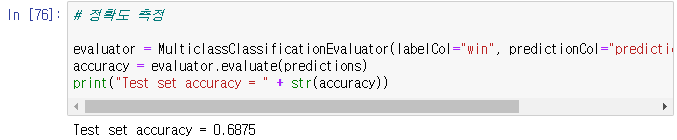 evaluator = MulticlassClassificationEvaluator(labelCol="win", predictionCol="prediction", metricName="accuracy")