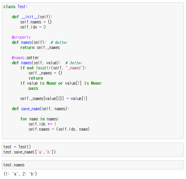 setter는 @변수명.setter와 같이 선언해주면 된다.